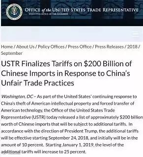 美国东部时间9月17日收市后,特朗普政府宣布新一轮关税,对价值2000亿美元中国进口商品征收10%关税。10%的新关税将于9月24日生效,并在2019年1月1日起上升至25%。