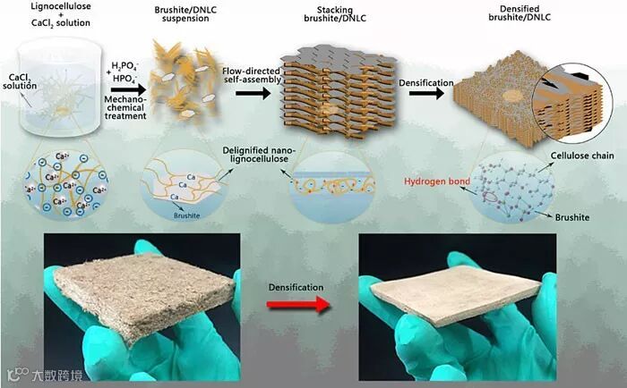 可再生、可降解、碳中性、低成本、来源丰富的天然木质纤维素由于其可与传统增强纤维相媲美的高比强度而一直备受建筑和家具行业的青睐。近日,浙江农林大学金春德和孙庆丰研究小组通过将脱除部分木质素和半纤维素的木质纤维素与磷酸氢钙通过机械热磨法复合,在经过真空水流定向组装和热压,获得了层状结构密实化的纳米木质纤维素/磷酸氢钙复合材料。