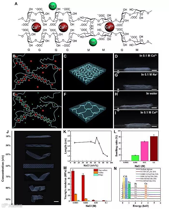 图2. Na+/Ca2+触发海藻酸钠水凝胶可控三维形变机制分析(A-I)钙离子交联海藻酸钠离子置换机制,及水凝胶在不同溶液体系中差异;(J)Na+与Ca2+混合体系可控“冻结”三维形变;(K-N)溶胀率测试,AFM力学分析以及EDS能谱分析验证Na+与Ca2+离子置换触发水凝胶溶胀或收缩机制。