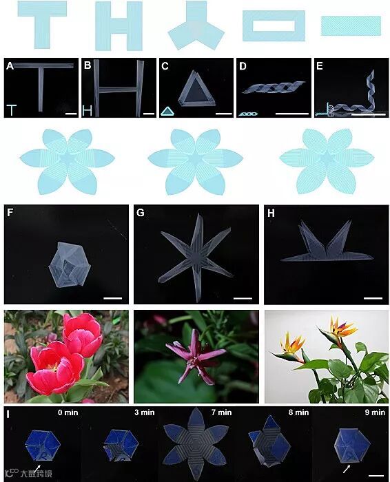 图3. (A-E)海藻酸钠水凝胶的多种复杂三维结构图(T形、H形、三通管状结构、双螺旋、串联三螺旋);(F-H)基于海藻酸钠水凝胶的多种仿生花形貌图;(I)仿生花在离子溶液中动态绽放闭合图。