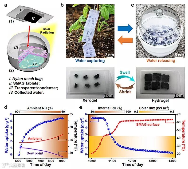 经测试,这种超强吸湿凝胶在不同湿度氛围下可捕捉空气中游离的水分子,并在阳光照射的加热效应下,将捕获的水分释放出来。如图1所示,当一个标准的吸-释水循环被设定为1小时,其中50分钟用于吸水,10分钟用于释放水,1千克该材料可以在相对湿度为60%的环境中24小时内产出近20升淡水。而当环境湿度上升至90%时,产率可达50余升。上述结果充分证实在该凝胶材料具有相当强大的空气取水能力。在此基础上,研究团队还凝胶材料制成吸水包,并组装了空气吸水和光照释水的简易装置(如图2)。在无任何外加能源的实地测试中,这种装置仍然展现出良好的吸水、释水性能,一定程度上揭示了这种新型凝胶材料的实用前景。该研究结果为正对空气取水的凝胶基复合材料设计提供了新的思路,并且为超亲水高分子材料在环境调控领域的应用开创了新的方向。