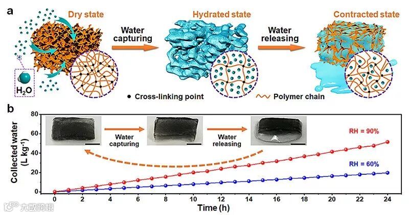 为了实现更环保、高效的空气取水,美国德克萨斯大学奥斯汀分校的余桂华教授(通讯作者)课题组开发了一种新型超强吸湿凝胶。他们利用复合凝胶中的分子互穿机制,将吸湿高分子和温度响应性亲水高分子相结合,实现了空气取水、原位储水及响应释水三位一体的独特功能。不同于传统的表面吸附性空气取水材料,该凝胶材料可利用吸湿高分子网络吸收水分并将其液化。液化后的水分可部分转移至亲水分子网络。而亲水分子网络的温度响应特性使所含的液态水在温度超过特定值时被快速排出,从而实现可收集的纯净淡水。为了探索该种新型凝胶的使用价值,研究团队还进一步通过基于超强吸湿凝胶的空气取水器考察了户外水收集性能,以模拟自然环境中的空气取水过程。