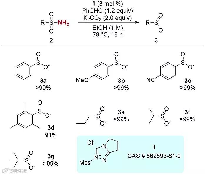 作者以苯磺酰胺为模型底物对反应条件进行筛选,包括不同醛、碱和溶剂,然而经过一系列的考察,只观察到微量的亚磺酸盐产物生成。他们认为使用NHC催化剂可能会降低消除亚磺酸盐离去基团的能垒,促进反应发生。在苯甲醛、K2CO3和3 mol%三氮唑类NHC预催化剂1的存在下,苯磺酰胺能定量地转化为苯亚磺酸盐,同时生成副产物苯甲腈。