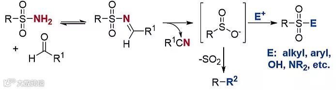 对于磺酰胺基团向其他官能团的转化,作者提出最通用的策略是将磺胺类化合物转化为相应的亚磺酸盐,亚磺酸盐可通过直接或消除SO2后捕获亲电试剂进一步官能化,这类反应通常可以在温和的条件下发生。为了实现这一目标,他们将一级磺酰胺与醛缩合生成N-磺酰亚胺,释放当量的副产物腈便产生亚磺酸负离子。