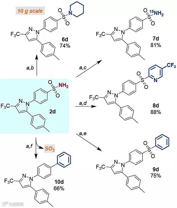 为了进一步验证这种后期官能化方法的实用性,作者展示了原位生成的亚磺酸盐粗产物可以发生多种不同的官能团转化。磺酰胺脱胺化后形成亚磺酸盐,体系中加入I2可实现磺酰胺与胺的相互转化。该方法不仅在小规模的构效关系研究中十分高效,而且很容易扩大规模,用于制备十克级规模的化合物6d。他们还以15NH4OH作为胺源,可从14N母体分子出发直接获得15N标记的磺胺类药物,能选择性完全交换14N到15N,且不需要其他额外的合成步骤,这对于标记化合物的合成并进行药物发现的药理学研究具有重要的价值。