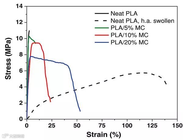 PLA-MC体系的拉伸性能测试。图片来源于:Adv. Mater.