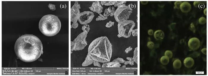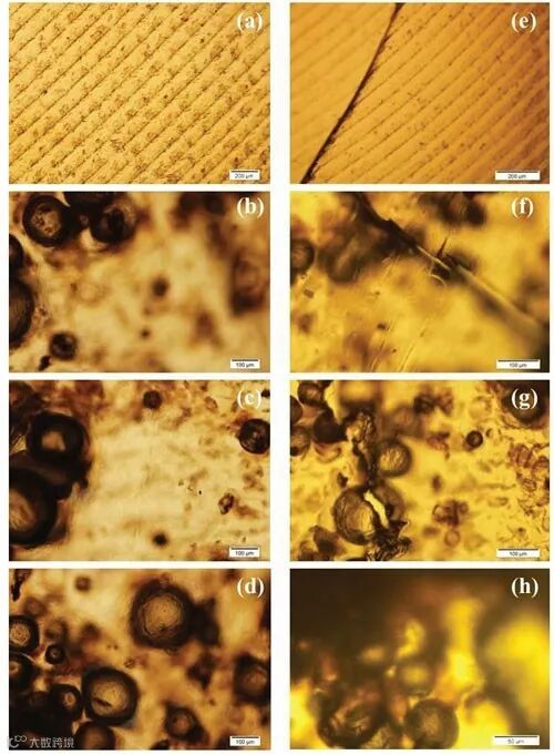 基于乙酸己酯的低熔点(-80 ℃)、高沸点(182 ℃)及低挥发特性,研究人员将其作为增塑体系封装入PUF微胶囊中进行相应聚合物自增韧研究。SEM及TGA测试表明:PUF-MC直径为67 ± 22 µm,壁厚 15 ± 8 µm,乙酸己酯封装率达66 ± 1%。选用的聚合物基体为非晶态的外消旋聚乳酸(聚DL乳酸),玻璃化转变温度约55 ℃;SEM表征显示MC在PLA体系内具有良好的分散性。