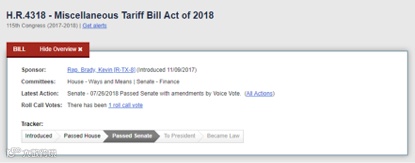 这个法案名叫Miscellaneous Tariff Bill,中文叫“综合关税法案”(也被译成“关税杂项法案”)。