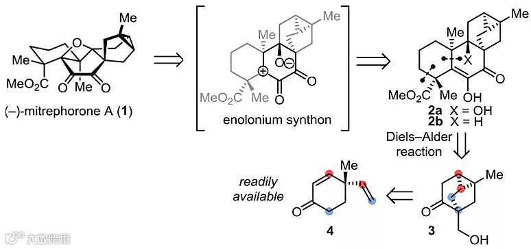 通过逆合成分析,作者认为(–)-Mitrephorone A的氧杂环丁烷骨架可以通过中间体2a羟基和烯醇酮的分子内氧化环化来构筑,而2a的左侧并环可以通过分子内Diels-Alder反应构筑,右侧的桥环也可以通过中间体4的分子内Diels-Alder反应得到。