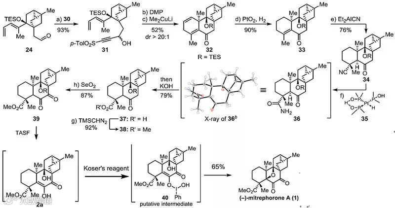 炔基锂30对醛24加成得到醇31,31通过Dess-Martin试剂氧化成酮,炔基末端的对甲苯磺酰基被二(甲基铜锂)取代后自发发生分子内Diels-Alder反应得到双烯32,立体化学通过桥环很好的控制。PtO2(Adams' catalyst)选择性还原富电子和位阻小的双键得到烯酮33,此时需要引入甲基来构筑季碳中心。起初,作者尝试用传统的氰基化试剂((C2H3)2Cu(CN)Li2)和(Et2AlCCTMS)都没有成功实现1,4-加成。幸运的是,Et2AlCN(Nagata's reagent)成功实现了这种转化得到34。然而,水解氰基时却遇到困难,34在常规KOH条件下发生氰基离去,重新得到烯酮33。查阅文献发现,Ghaffar和Parkins在1995年发展了均相催化剂[PtH(PMe2OH)((PMe2O)2H)],可以很高的转化数水解氰基得到酰胺。酰胺36原位使用KOH处理得到酸37,随后在TMSCHN2的作用下生成酯38,后者通过二氧化硒氧化形成二酮39(Riley oxidation)。在TASF消除硅保护基的同时,39异构化形成烯醇2a,2a再在三价碘试剂PhI(OH)OTs(Koser's reagent)的作用下经过4-exo-trig 氧化环化最终完成天然产物(–)-Mitrephorone A的合成。