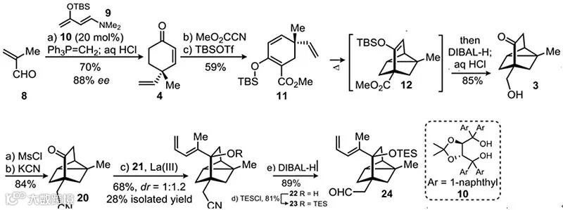 如果把逆合成分析比作运动员健硕的身材,那么每一个合成步骤就是在秀一块块肌肉。作者从异丁烯醛8出发,8与Rawal二烯在TADDOL(10)的催化下发生Diels-Alder反应后再分别进行Wittig甲基化和酸水解,得到手性烯酮4。碱性条件下用Mander试剂处理4后,烯醇被TBS捕获生成11,后者在加热下发生分子内Diels-Alder反应,再原位进行DIBAL-H还原酯基得到醇3,随后经过简单的亲核取代转换成氰基化合物20。由于亲核试剂对桥环20的加成存在面选择性的问题,第一个挑战来了,如何构筑下一个D-A反应的双烯体?经历多种尝试,包括不同的双烯亲核试剂(Li、Mg、Ge、Zn)、配体((S,S)-salen、(+)-sparteine)或手性辅基,研究人员发现仅双烯体为二乙烯基锂、LaCl3•2LiCl作为Lewis酸时,反应能以28%的分离产率得到加成产物22(d.r. = 1:1.2)。DIBAL-H还原氰基后得到醛24。