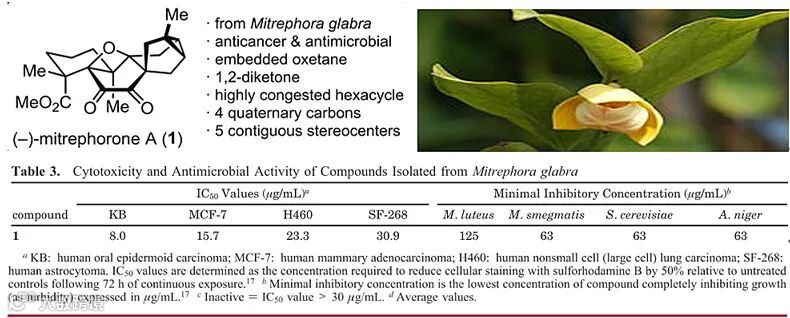 以紫杉醇为代表的含氧杂环丁烷结构的天然产物在人类抗击癌症和推动有机化学发展的历史上立下了汗马功劳,它们复杂的环系及优秀的生物活性引起合成化学家和药物化学家极大的兴趣。今天的主角(–)-Mitrephorone A(1)也是其中一员,该分子是一种二萜类化合物,于2005年Oberlies及其同事从婆罗洲灌木Mitrephora glabra(银钩花属)中分离得到。(–)-Mitrephorone A(1)具有高度取代的氧杂环丁烷和环丙烷修饰的紧凑六环骨架,5个连续的立体中心,4个季碳中心,还包括罕见的1,2-二酮结构。该天然产物除了具有抗菌活性,还对多种肿瘤细胞系(KB、MCF-7、NCI-H460、SF-268)具有有效和广谱的抑制活性。