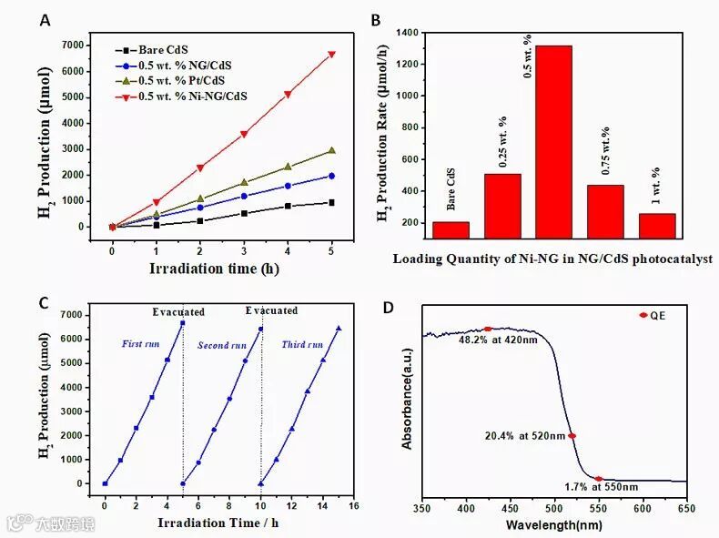 Figure 1. (A) Photocatalytic H2 evolution over Ni-NG/CdS, Pt/CdS, NG/CdS and bare CdS under visible light irradiation (> 420 nm). (B) Ni-NG loading quantity effects on the photocatalytic activities of CdS for H2 production. (C) Photocatalyst lifespan tests over 0.5 wt.% Ni-NG/CdS. (D) Photonic adsorption spectrum and quantum efficiencies of 0.5 wt.% Ni-NG/CdS. (Photocatalyst: 5 mg; Photolyte: 10 mL 1.0 M (NH4)2SO3 solution; Light Source: 300 W Xe light; UV cutoff filter: > 420 nm).