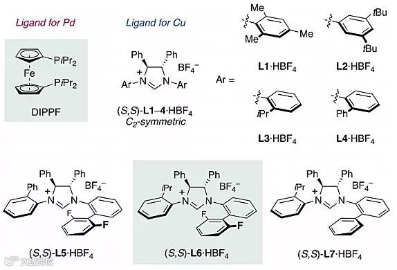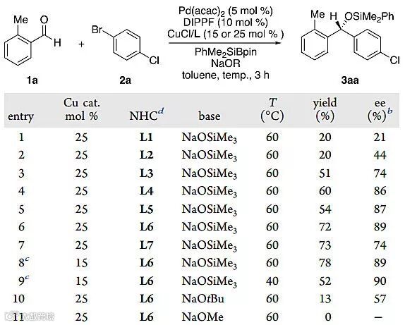 基于以往对手性催化剂体系初步的研究,作者考察了各种手性NHC配体与Cu(I)结合,在5 mol% [Pd(acac)2]、1,1'-二异丙基膦二茂铁(DIPPF)(10 mol%)的作用下,邻甲基苯甲醛(1a)、对溴氯苯(2a)与(二甲基苯硅基)硼酸频哪醇酯[PhMe2SiB(pin)]作为模板底物的反应结果。CuCl、L•HBF4和NaOSiMe3混合可原位制得Cu(I)-NHC配合物。其中L4作为配体的收率(60%)和对映选择性最佳(86% ee,entry 4)。接着,作者制备了新的带有2-(2,6-二氟苯基)苯基的手性NHC配体L5替代L4中的2-联苯基,以调控铜中心的空间位阻。使用L5作为配体的对映选择性为87% ee,略优于L4(entry 5)。将L5的2-联苯基换作2-异丙基(L6),产物的收率提高到72%,对映选择性提高到89% ee (entry 6)。Cu催化剂的负载量降低到15 mol%,产率略有提高,对映选择性保持不变(entry 8)。反应温度降低到40 °C时(entry 9),对映选择性进一步提高到90% ee。作者发现,使用相应的无氟NHC配体L7会使对映选择性显著降低。碱烷氧基的位阻和电性也很重要,使用碱性更强的NaOtBu代替NaOSiMe3会降低反应的收率和对映选择性,可能是由于NHC配体部分解离而形成非手性的硅基(叔丁氧基)铜物种。