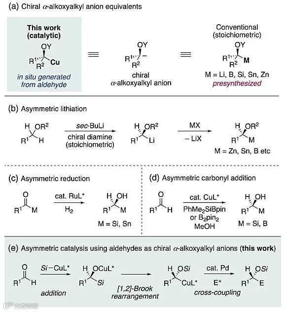 手性α-杂原子取代的碳负离子是一种具有重要研究价值的sp3杂化碳亲核试剂,可用于手性分子的合成。其中,α-烷氧基烷基阴离子在构建手性醇方面应用广泛。常规构建α-烷氧基烷基阴离子的方法通过预先制备化学计量的有机金属试剂来实现(图1a)。Hoppe和Hense等人利用碱性强的烷基锂试剂和化学计量的手性胺作为原料,通过脂肪醇衍生物的对映选择性α-去质子化得到手性α-烷氧基烷基锂(图1b)。α-烷氧基烷基锂可转化为其它有机金属试剂,如有机锌、有机锡和有机硼化合物。另外,不对称还原酰基金属化合物,如酰基硅或酰基锡,可用于制备手性α-羟基碳负离子等价物(图1c)。近年来,铜催化羰基化合物的对映选择性亲核硅烷化和硼化反应成为制备α-烷氧基烷基金属化合物的新方法,但其在有机合成中的应用尚不成熟(图1d)。