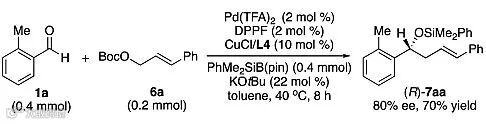 该反应不仅适用于芳基亲电试剂,还适用于其他不同的偶联体。例如,烯丙基碳酸酯6a在钯/铜协同催化下发生交叉偶联,以80%的产率和70%的ee值得到高烯丙醇衍生物7aa。