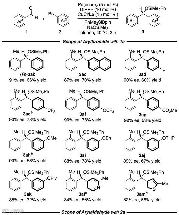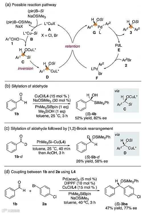 Hirohisa Ohmiya教授课题组报道了铜/钯双催化体系下,芳香醛、芳基溴化物和硅基硼酸酯发生三组分的不对称交叉偶联反应,高对映选择性产生手性硅基保护的二级醇衍生物。该钯/铜催化体系也可用于烯丙基碳酸酯参与的偶联过程。该方法为不对称构建手性α-烷氧基烷基阴离子提供了一种新的策略。