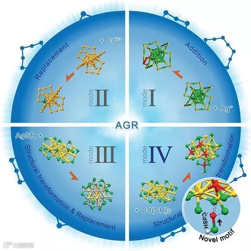 鉴于原子单分布的合金纳米团簇合成困难,伍志鲲研究员课题组发展了“反伽伐尼还原”的合成方法,方便、高产地合成了一系列二元合金纳米团簇(Nano Lett., 2015, 15, 1281; J. Am.Chem. Soc., 2015, 137, 9511; J. Am. Chem. Soc., 2015, 137, 153; Chin. J. Chem., 2017, 35, 567 等)。值得一提的是,利用反伽伐尼还原进行合金化时,有多种方式,截止到2017年,共发现三种方式,分别为加成、取代、结构转变后再取代三种方式(分别对应图1中I, II, III部分)。在2018年初,伍志鲲研究员课题组报道了第四种合金化方式——结构转变后非取代,即外来金属原子的引入导致原来母体团簇结构的转变,但没有取代原来的金属原子(见图1中IV部分,另见Angew. Chem. Int. Ed., 2018, 57, 11273)。