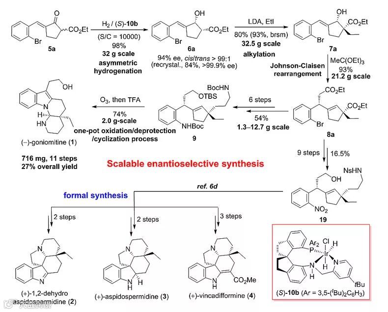 该课题组一直致力于用高效不对称催化氢化反应为关键步骤来实现复杂天然产物分子的高效不对称全合成研究。在(-)-Goniomitine的不对称全合成研究中,他们在其手性骨架结构的启发下,设计了经消旋5-芳亚苄基-2-乙氧羰基环戊酮的不对称催化氢化来控制分子的手性构型,酯基-位烷基化构建手性季碳中心,Johnson-Claisen重排反应构建吲哚乙醇侧链及环戊烯结构,以及采用与祝介平等发展的氧化/还原/环化(iORC,integrated oxidation/reduction/cyclization)类似的一锅构建四环骨架结构(Angew. Chem., Int. Ed., 2013, 52, 3272; J. Am. Chem. Soc., 2014, 136, 15102)的策略完成了(-)-Goniomitine的高效不对称全合成。在氢化反应研究中,他们发现手性螺环铱催化剂Ir-SpiroPAP((S)-10b)给出很好的催化活性和对映选择性。在催化剂用量为0.01 mol%,能克级规模得到相应的手性醇6a。烷基化反应构筑手性季碳中心也可克级规模进行,且能以80%的收率得到中间体7a。接着,他们巧妙地利用Johnson-Claisen重排反应引入吲哚乙醇侧链的同时得到后续经氧化开环/环化一锅构建四环骨架结构所需环戊烯结构的合成。随后,经多步常规转化以及钯催化引入胺基等反应步骤完成关键中间体9的不对称合成,并经分子内一锅氧化开环/脱胺基和羟基保护/环化的串联反应完成(- )-Goniomitine的不对称全合成。整个合成路线简洁、高效,每步均可克级规模进行,最终以11步27%的总收率克级规模地完成(-)-Goniomitine的不对称全合成。基于这一策略,他们还完成了具有五环骨架结构的白坚木生物碱(+)-1,2-dehydroaspidospermidine (2), (+)-aspidospermidine (3) and (+)-vincadifformine (4) 的形式不对称全合成。