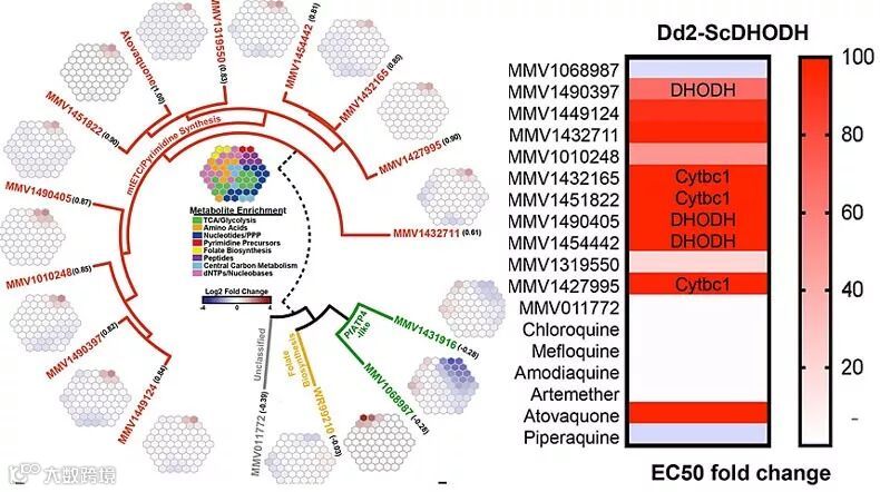 通过代谢组学分析,发现13种代表化合物(Tanimoto相似性很小,说明这些化合物和之前报道的抗疟疾药结构类型差别较大)中10个与线粒体电子转移链(mETC)有关。利用转基因的高表达二氢乳清酸脱氢酶(DHODH)的疟原虫,这些化合物的EC50变化很大(24-1000倍),表明作用于DHODH。此外,研究者认为还有化合物可能具有先前未知的作用机制。
