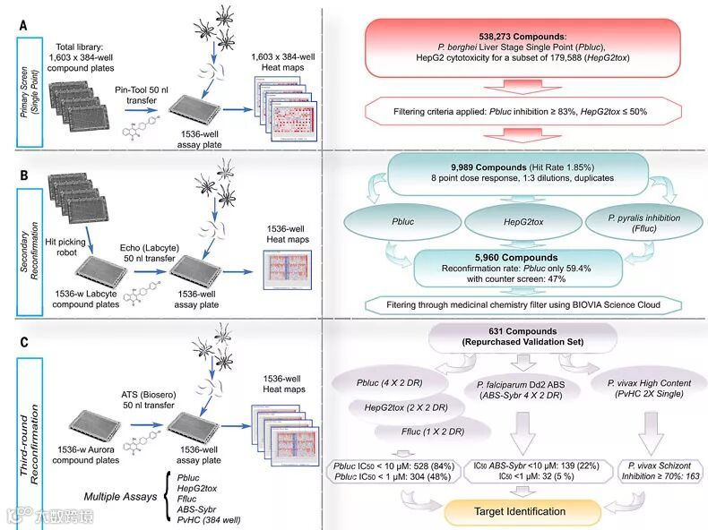 随后,他们历时18个月,将Charles River化合物库(分子量60-1298 Da,基本满足Lipinski五规则)的538,273个小分子进行高通量筛选(平均每周筛约20,000个,因为有些需要重复实验,当然产生细胞毒的也要排除)。经过三轮筛选(每轮标准不同)留下半数抑制浓度IC50小于1 μM的631个化合物待靶点验证。值得一提的是,这次发现的不少化合物骨架,在此前并没有报道可用于疟疾的预防和治疗。
