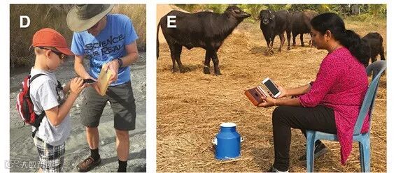 Mbira密度传感器+智能手机在野外现场测试河水(D)及牛奶(E)的密度。图片来源:ACS Omega