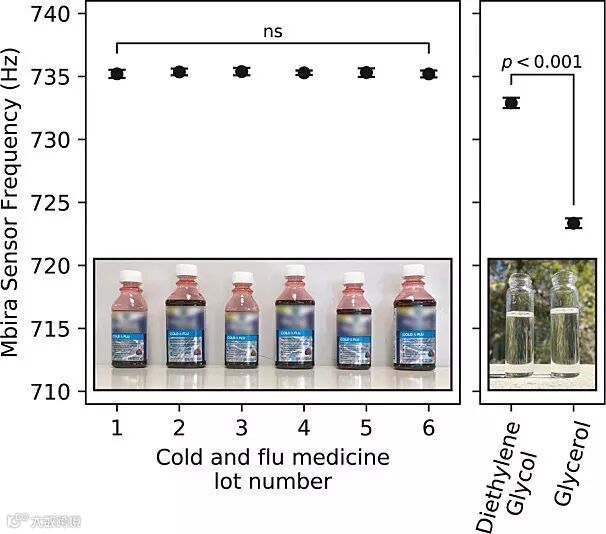Mbira密度传感器鉴别药物以及区分甘油和二甘醇。图片来源:ACS Omega