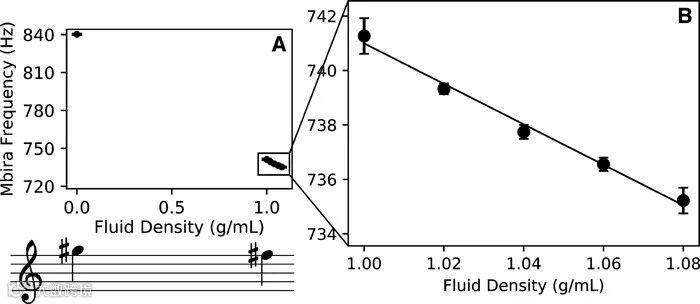 Mbira密度传感器声音频率和样品密度关系。图片来源:ACS Omega