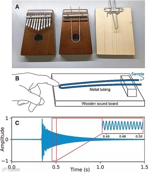 研究者利用弯曲成U型的中空钢管代替金属片,将Mbira(下图A左)改造成了一种密度传感器(下图A中、右)。原理很简单:液体样品装入中空钢管中,然后拨动钢管发出声音,由于声音的频率与注入的液体样品密度呈线性关系(f ≈ aρ+b),因此可以用智能手机上安装的专门软件测量频率并读出密度大小。