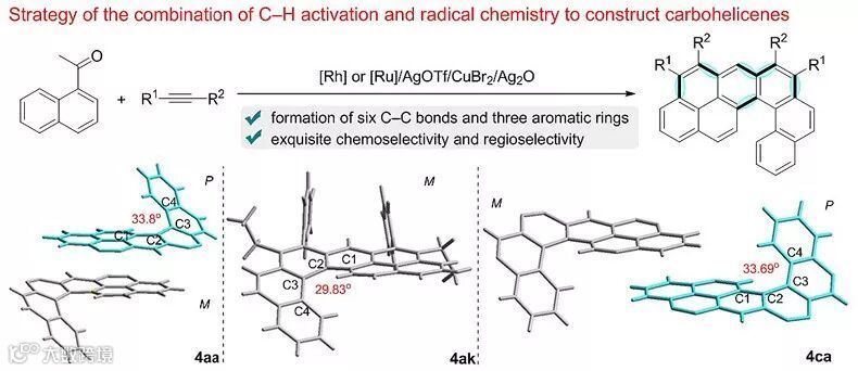 不同于平面型的多环芳香碳氢化合物,碳螺烯是由多个芳环通过邻位稠合所形成的螺旋状的π骨架。其具有的扭曲的π表面、独特的动力学特性、固有的手性、良好的溶解性等方面的性质,使它们被广泛应用于多个学科领域。多年来,光化学合成、Scholl反应、Diels-Alder环加成反应、Friedel–Crafts反应等是合成碳螺烯的主要方法。随着过渡金属催化的偶联反应和环加成反应的发展,合成碳螺烯的策略也得到了进一步的发展,主要包括以下四种:(1)分子内Stille或Suzuki偶联;(2)分子内的C–H/C–X(X = Cl, Br 或 I)偶联反应;(3)分子内的炔参与的环加成反应;(4)钌催化的分子内的烯烃复分解反应。这些已有的合成碳螺烯的方法大都需要高度预活化的底物,而且操作步骤繁琐,导致了产物类型的局限性。所以发展一种简洁高效的策略合成结构多样化的碳螺烯骨架十分必要,同时也充满了挑战。最近,四川大学化学学院的游劲松教授课题组利用简单易得且结构多样的萘乙酮类衍生物和内炔作为底物,通过碳氢活化和自由基策略的结合,简洁高效地合成了一系列碳螺烯骨架。