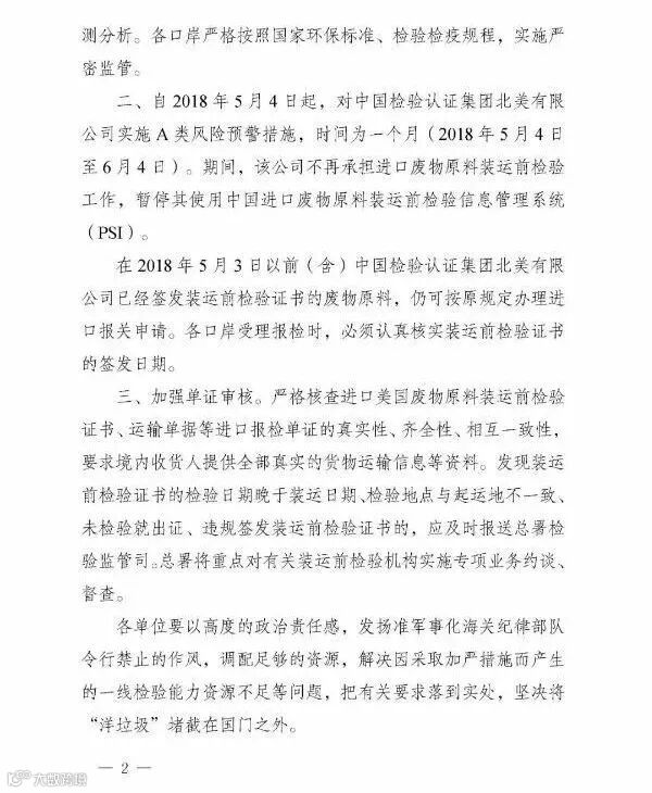 自2018年5月4日起,对中国检验认证集团北美有限公司实施A类风险预警措施,时间为一个月(2018年5月4日到6月4日)。期间,该公司不再承担进口废物原料装运前检验工作,暂停其使用中国进口废物原料装运前检验信息管理系统(PSI)。