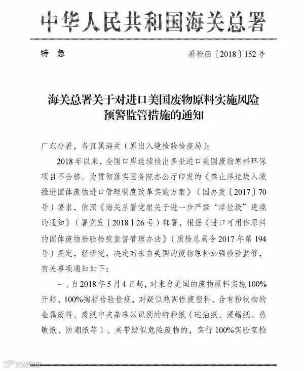 5月2日,国家海关总署突然发布特急文件《海关总署关于对进口美国废物原料实施风险预警监管措施的通知》,对进口美废使出一记从未有过的监管重拳!该文件共提出三项措施:
