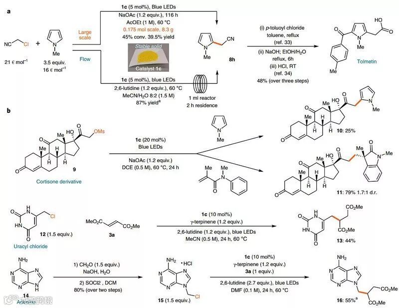 作者认为富电子的芳基化合物与自由基作用可以生成环己二烯自由基VI,避免了化学计量氢原子供体的使用,这一过程可用于制备(杂)芳香族化合物。芳基丙烯酰胺6经过连续的自由基加成/环化反应(1c作为催化剂)得到一系列取代的羟基吲哚衍生物7(图4c)。同样,富电子的(杂)芳香族化合物(包括未保护的吡咯8i)也可直接以氯代烷烃作为自由基前体实现自由基官能化(图4d)。醛基、仲胺和游离羟基等官能团均可与该反应体系兼容。再一次证明该催化体系具有良好的应用范围。