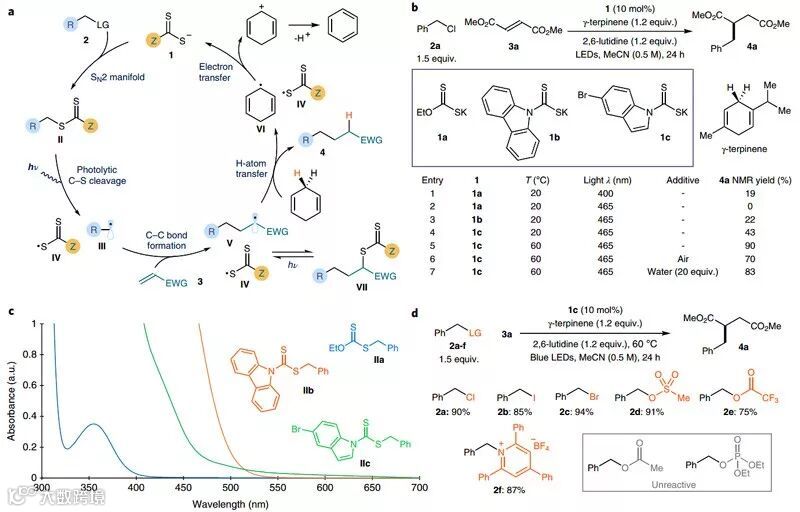 作者首先提出了可能的反应机理,二硫代羰基阴离子1作为亲核性催化剂与烷基亲电试剂2反应,其中1经过SN2历程取代2中的离去基团得到中间体II(图3a)。中间体II的C-S键较弱(如苄基-N,N-二甲基二硫代氨基甲酸酯,BDE=31.3 kcal•mol-1)。在低能量光子条件下,该C-S键即可断裂生成目标自由基III和二硫代羰基自由基IV。自由基III能与缺电子烯烃反应形成C-C键,并形成亲电自由基V。而V可以从1,4-环己二烯(1,4-cyclohexadiene,1,4-CHD)攫取氢原子形成最终的产物4和环己二烯基自由基VI。接着二硫代羰基自由基IV与VI发生SET还原反应,同时重新生成催化剂1,由此完成催化循环。该机理通过以下几点得到证实:(1)二硫代碳酸根和二硫代氨基甲酸根阴离子具有很强的亲核性;(2)II型硫代羰基化合物光解时能生成自由基并促进聚合反应发生;(3)1,4-CHD既能提供氢原子,还能提供电子。