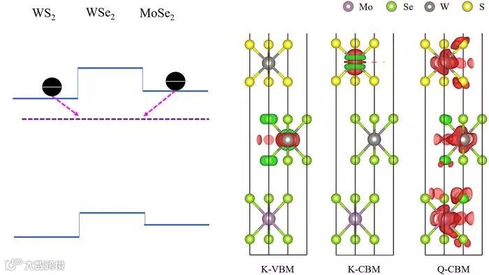 最近,堪萨斯大学赵辉教授和北京师范大学的龙闰教授合作,采用超快动力学光谱结合密度泛函理论计算,详细研究了MoSe2/WSe2/WS2异质结的电子结构和电荷转移动力学,指出形成的层间耦合态是顶层WS2与底层MoSe2超快电荷转移的通道。赵辉教授实验组发现,尽管存在WSe2的能垒(见能带排列示意图),电子仍然能够从MoSe2超快地转移至WS2。更令人惊奇地是,尽管WS2位于K谷的导带底能级比MoSe2的低,电子仍能够反方向有效地从WS2转移至MoSe2。这些发现表明电荷转移可能是通过一个比所有材料的导带底能级都要低的一个层间耦合态进行的。龙闰教授课题组通过密度泛函理论计算MoSe2/WSe2/WS2异质结的电子结构,发现在低于异质结导带底的K能谷0.1eV处的Q能谷形成了层间耦合态。因此,无论是激发顶层的WS2还是底层的MoSe2,光激发产生的电子均会首先散射到Q能谷的层间耦合态上,从而实现超快的电子转移,这一结果与光致发光谱以及超快泵浦实验探测得到的现象一致。该研究为理解MX2异质结光诱导的非平衡态电荷和能量转移动力学提供了十分有价值的观点。