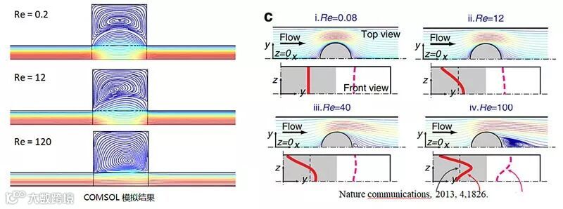雷诺系数(Re)的大小代表了流体惯性作用和粘度作用的比例。在微流体通道结构不变的情况下,流体流速增大,雷诺系数相应增大。通过流体力学模拟我们能准确预测在一定雷诺系数下涡流形成的形貌。通过理论模拟能帮助我们设计和优化微流控通道的结构达到预期目的,例如图中这篇2013年的Nature Communications 就计算了不同雷诺系数下的涡流形成。