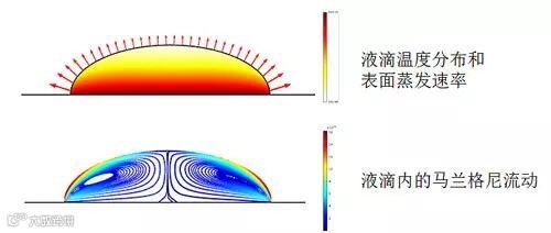 马兰格尼(Marangoni)效应是液体表面张力梯度引起的流体运动,液滴蒸发过程中的马兰格尼效应是非常经典的流体力学研究领域。液滴蒸发过程中一种马兰格尼效应产生的机理是这样的:蒸发产生的吸热效应会使液滴表面温度降低,液滴表面不同位置蒸发速率不同,导致了表面温度不同,温度梯度造成了表面张力的梯度进而形成马兰格尼效应。通过COMSOL Multiphysics 建模能同时计算蒸发、传热和表面张力梯度引起的流体流动。