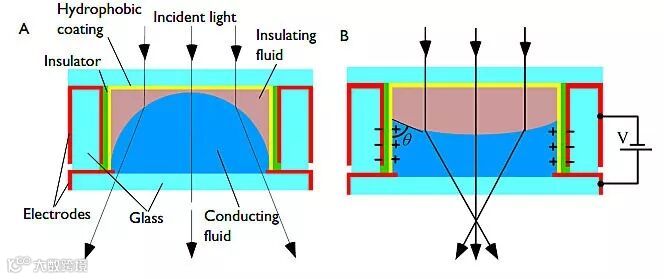 电浸润就是通过外加电场操控液滴在固体表面的接触角。在一个原本疏水的表面,液滴具有较大的接触角,当施加一定的电压能使接触角变小。通过电极的设计和不对称施加电场,就能定向操控液滴的运动。电浸润的另一种应用场景是制作变焦透镜,通过电压调节液滴表面的曲率实现透镜曲率的调节。