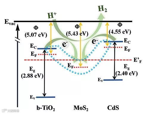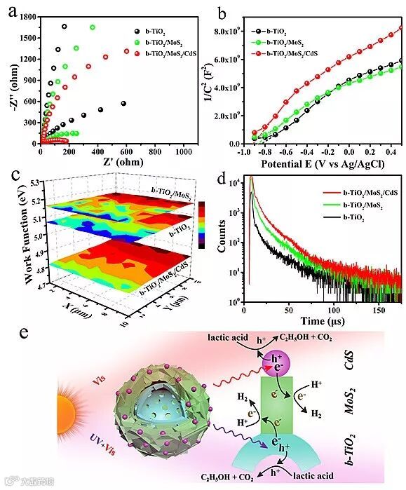 图3. 空心分级结构黑TiO2/MoS2/CdS串联异质结实现了光生电荷的高效分离和转移