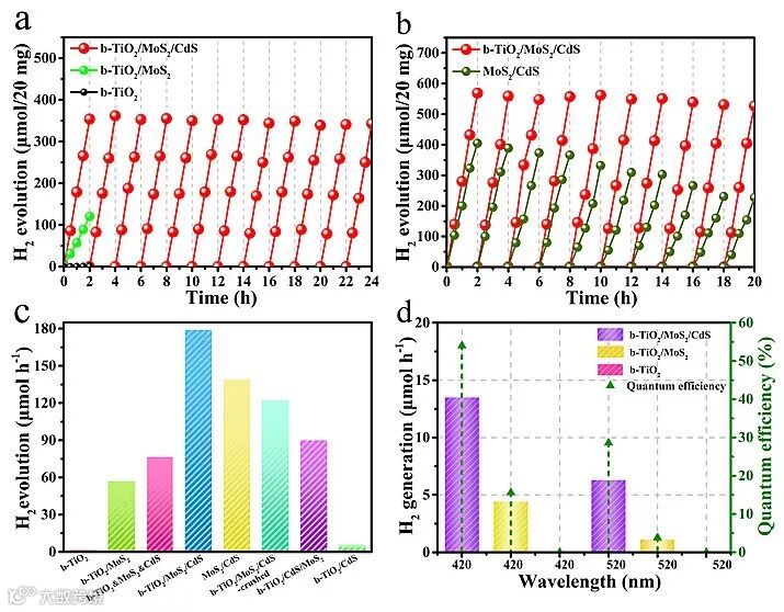 图2. 空心分级结构黑TiO2/MoS2/CdS串联异质结的光催化产氢性能