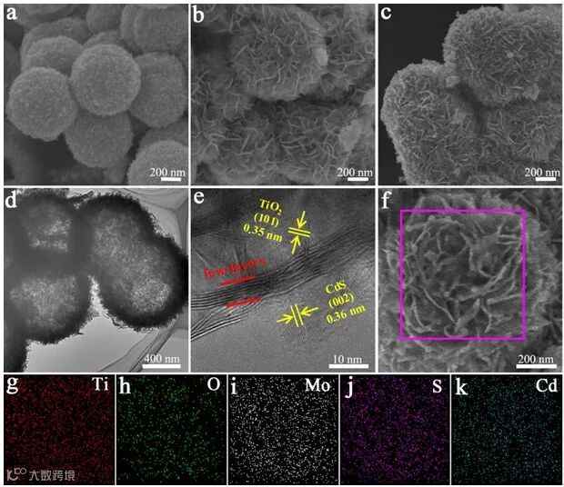 图1. 空心分级结构黑TiO2/MoS2/CdS串联异质结的电镜成像及元素分布
