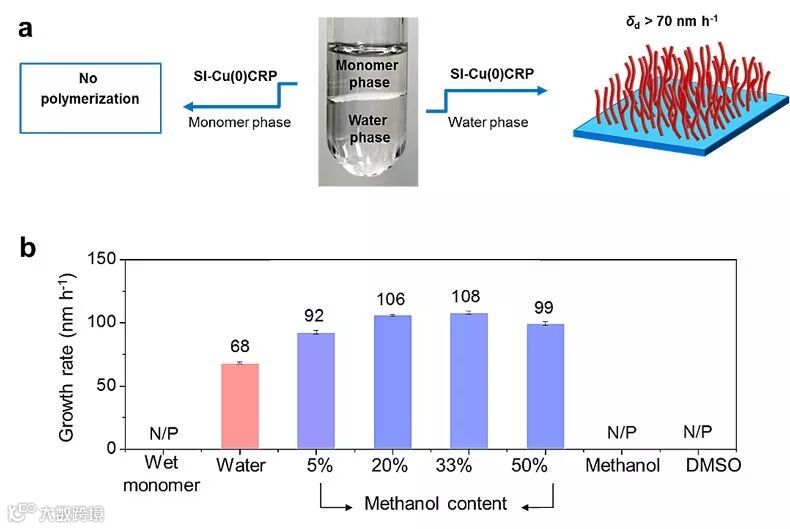 图2. (a)疏水单体和水溶液相分离以后的照片,上层液为单体,下层液为溶有微量单体的水溶液。(b)甲基丙烯酸酯(MMA)单体在不同溶剂和水溶液中的表面聚合反应速率。所有反应都未除氧。