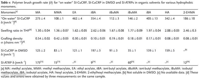 表1:制备各类聚合物分子刷的聚合速率(nm h-1):对比SI-Cu(0)CRP在水溶液(“on water”)和有机溶剂体系(DMSO),以及最常用的SI-ATRP(表面引发原子转移自由基聚合)。