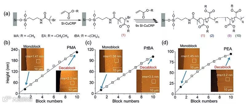图3. (a)示意图:连续引发的SI-Cu(0)CRP制备多嵌段聚合物。原子力显微镜和椭圆偏光仪的数据显示,(b)PMA,(c)PtBA和(d)PEA聚合物分子刷的厚度在每一次再引发聚合时都会稳定地增加。最终经过十次连续SI-Cu(0)CRP得到十嵌段聚合物刷。
