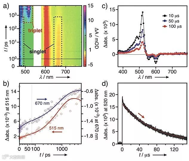 图5. 二维飞秒瞬态吸收谱图和纳秒时间分辨谱。图片来源:Angew. Chem. Int. Ed.