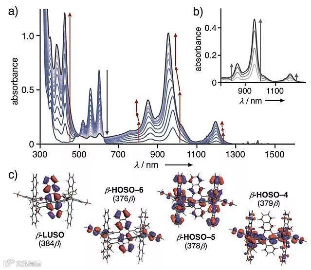 紫外/可见近红外光谱滴定研究进一步证实了纳米管1的自由基阳离子物种的产生及其分子内相互作用。在室温下,将三(4-溴苯基)六氯锑酸铵(Magic Blue)作为氧化剂添加到1的二氯甲烷溶液中,在350-500纳米(最高峰=426纳米)和650-1230纳米(最高峰=982纳米)范围内分别出现相对尖和宽的吸收带(图4a)。同时,1的吸收带(460-640纳米)逐渐减小。这些新产生的峰可指认为并五苯的典型自由基阳离子态,这表明了单自由基阳离子物种1•+的形成。自由基阳离子态并五苯(在982纳米处)的近红外吸收带的分步蓝移,归因于管状纳米结构内自由基阳离子和中性并五苯结构之间的分子内相互作用减少所致。