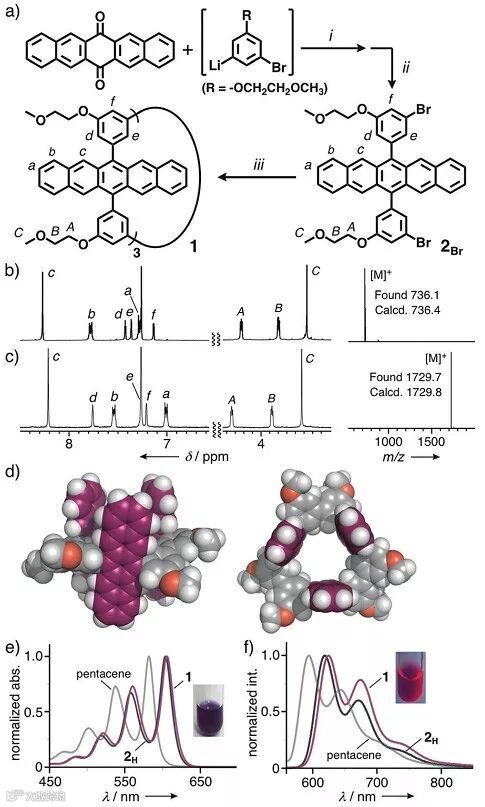 近期,日本东京工业大学的Michito Yoshizawa博士、日本庆应义塾大学的Hayato Sakai博士等研究者首次合成了具有管状构象的环状并五苯三聚体纳米管(图1c)。圆柱形的并五苯纳米管,长度和直径分别为1.5和0.8纳米,周围围绕着66个π电子。稳态和飞秒/纳秒瞬态吸收光谱分析表明,所获得的纳米管显示出并五苯发色团之间丰富的分子内电化学和光化学相互作用,这一现象在先前报道的并五苯聚合物以及其他环状低聚发色团中并未发现。