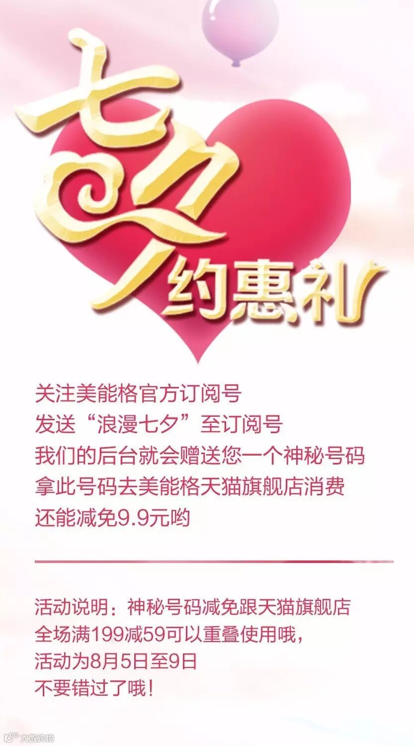 此外,美能格官方微信为答谢广大粉迷,关注美能格官方订阅号,发送“浪漫七夕”至订阅号,还能享受更多的优惠哦~
