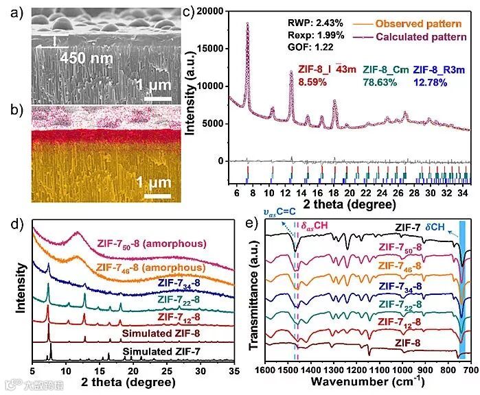 图2. 刚性混合双配体ZIF-722-8膜形貌特征及证明手段: XRD精修证明膜是刚性结构。XRD只有ZIF-8的特征峰而无ZIF-7特征峰,证明膜是单相的。ATR-IR同时含ZIF-8和ZIF-7的特征峰,说明两种配体都存在。由于只有一种相结构,但同时存在两种配体,这就证实了ZIF-7x-8膜的双配体结构。