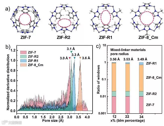 图3. 模拟计算ZIF-7x-8膜孔径:ZIF-7x-8杂化膜有四个可能的窗口类型,只有位于窗口平面内的配体才会影响孔径大小。窗口类型分为:含3个bIm配体型(ZIF-7),2个bIm加1个mIm配体型(ZIF-R2),2个mIm加1个bIm配体型(ZIF-R1),3个mIm配体型(ZIF-8_Cm)。